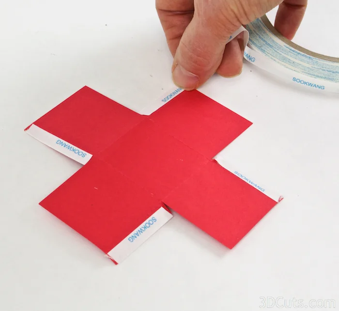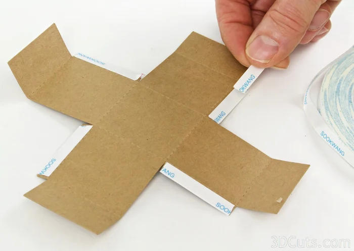 - Apply a strip of Scor-Tape to the outside of the two shorter side tabs.
