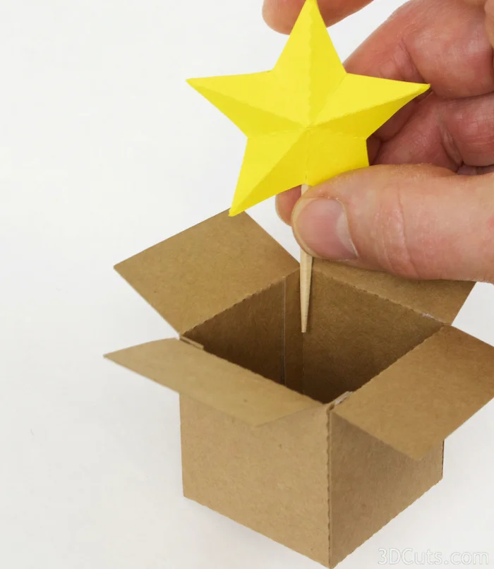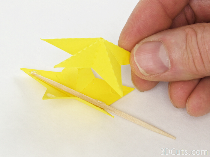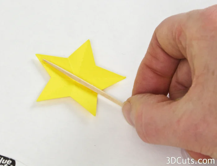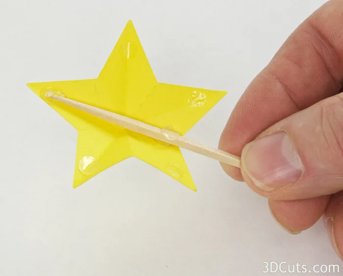 - Put a glue dot at the top and bottom of the star and glue a toothpick as shown on the inside of the star.
