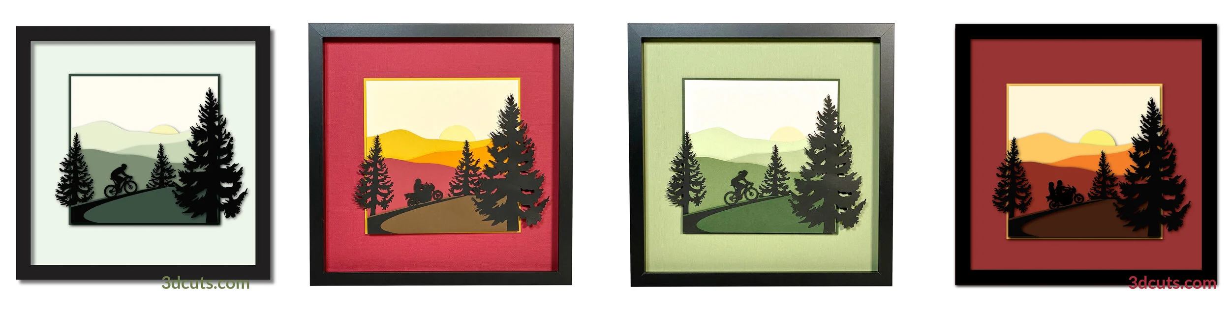 This tutorial is for all of the designs that come with the Easy Rider Shadow Box series. It includes files for 4 different choices riding through a mountain landscape. You can choose a male bicyclist. a female bicyclist, a man on a motorcycle or a couple all a motorcycle. Each is out on the open road.