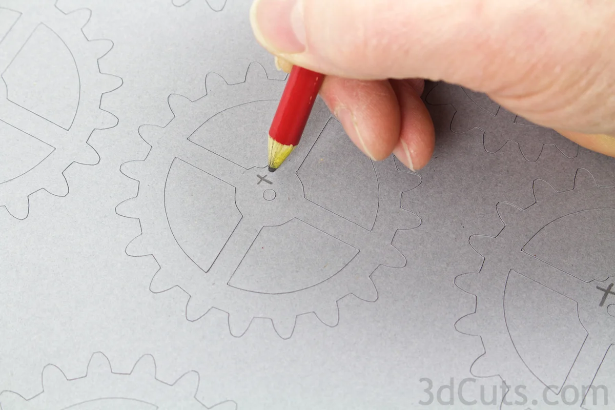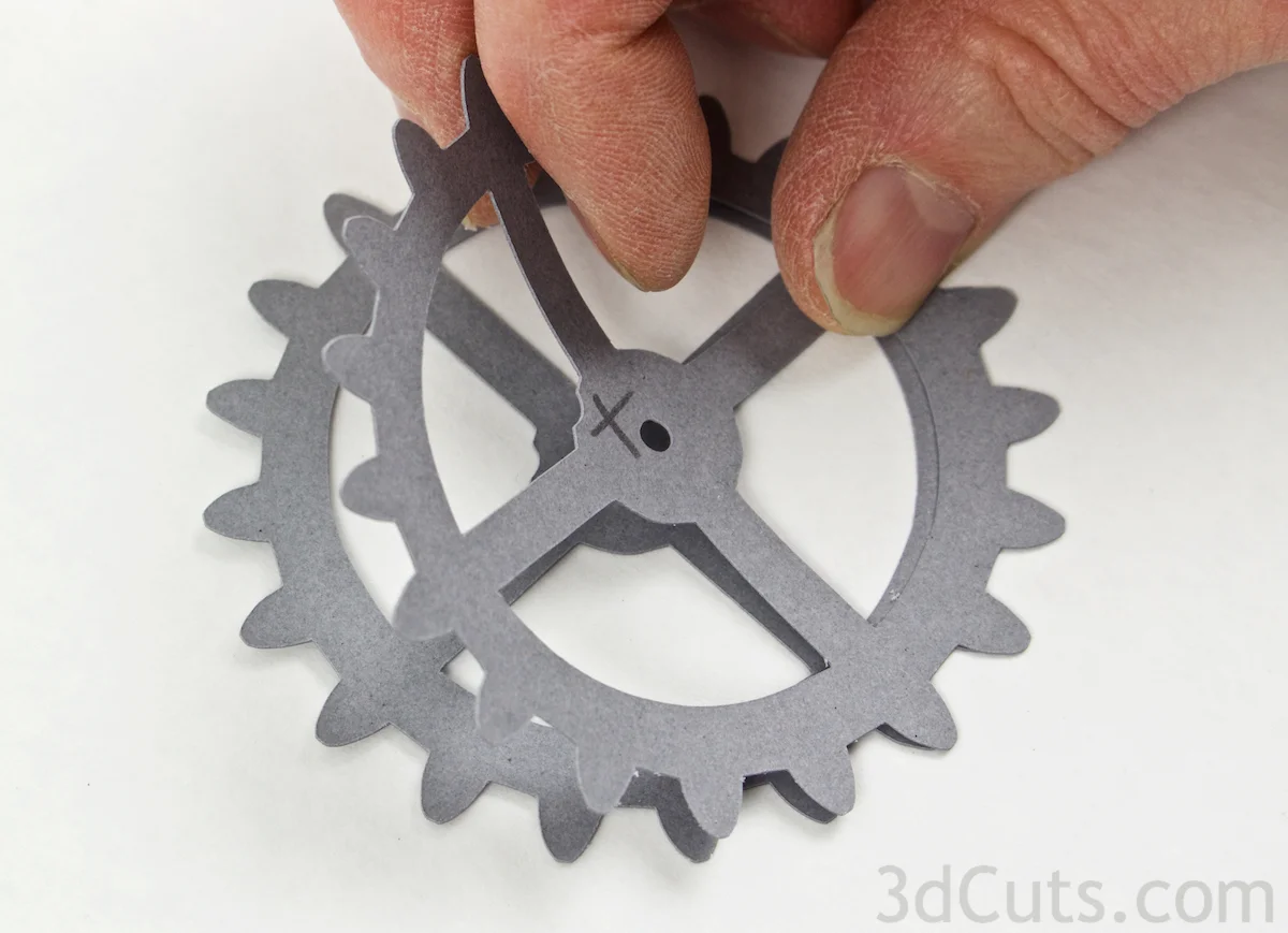 - Cut 6 identical gears for each 3d-working gear your design will include. It will help in placement if you mark the backside of each before taking it off the mat. This just makes lining them up for glueing easier.