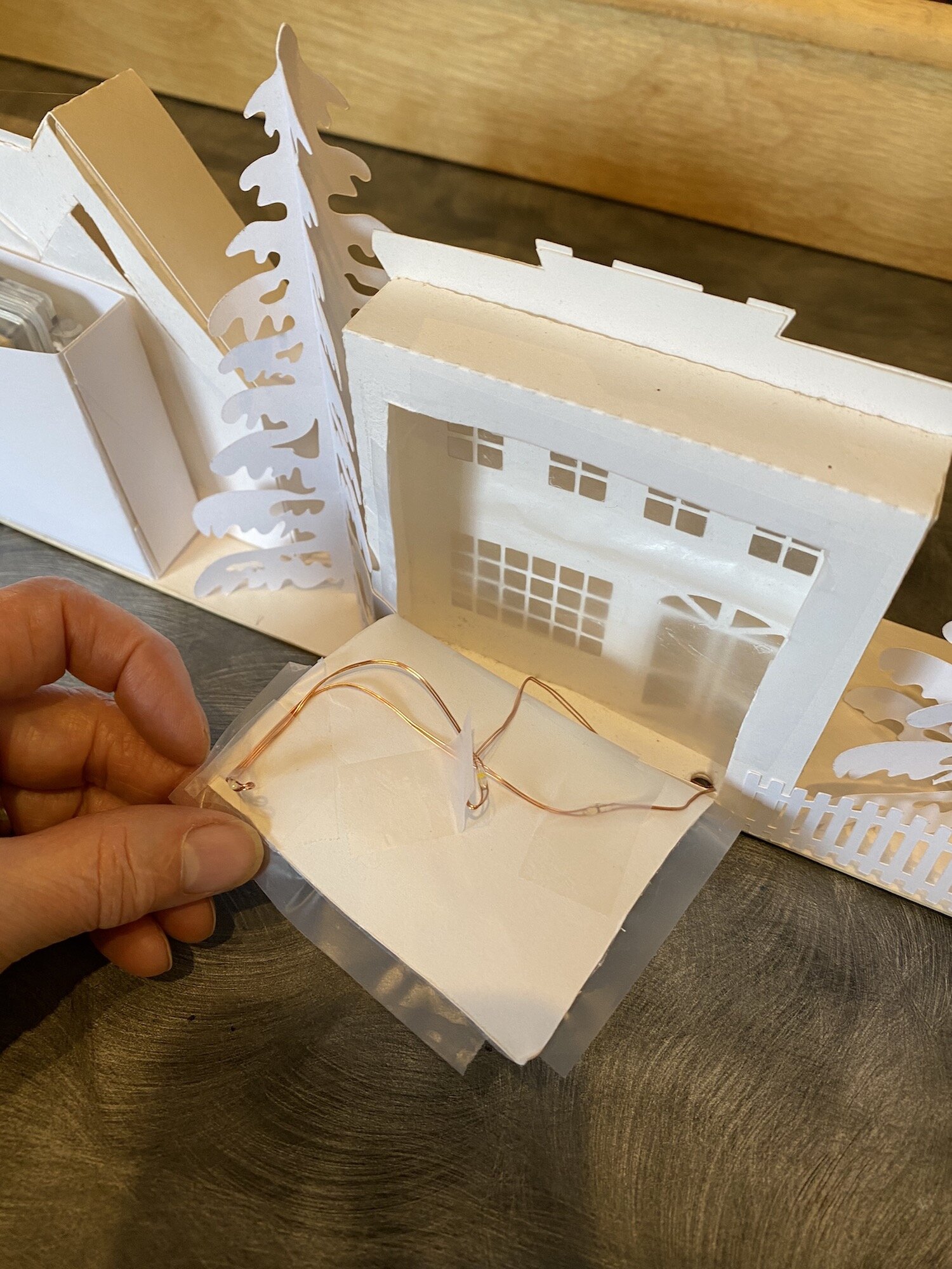 I then threaded 3-5 lights into the hole. The wire went in and out the same hole. I arranged the lights on the back wall and taped into place. Visually it was best if the lights weren’t visible through a window - but hidden of to the side or below.
