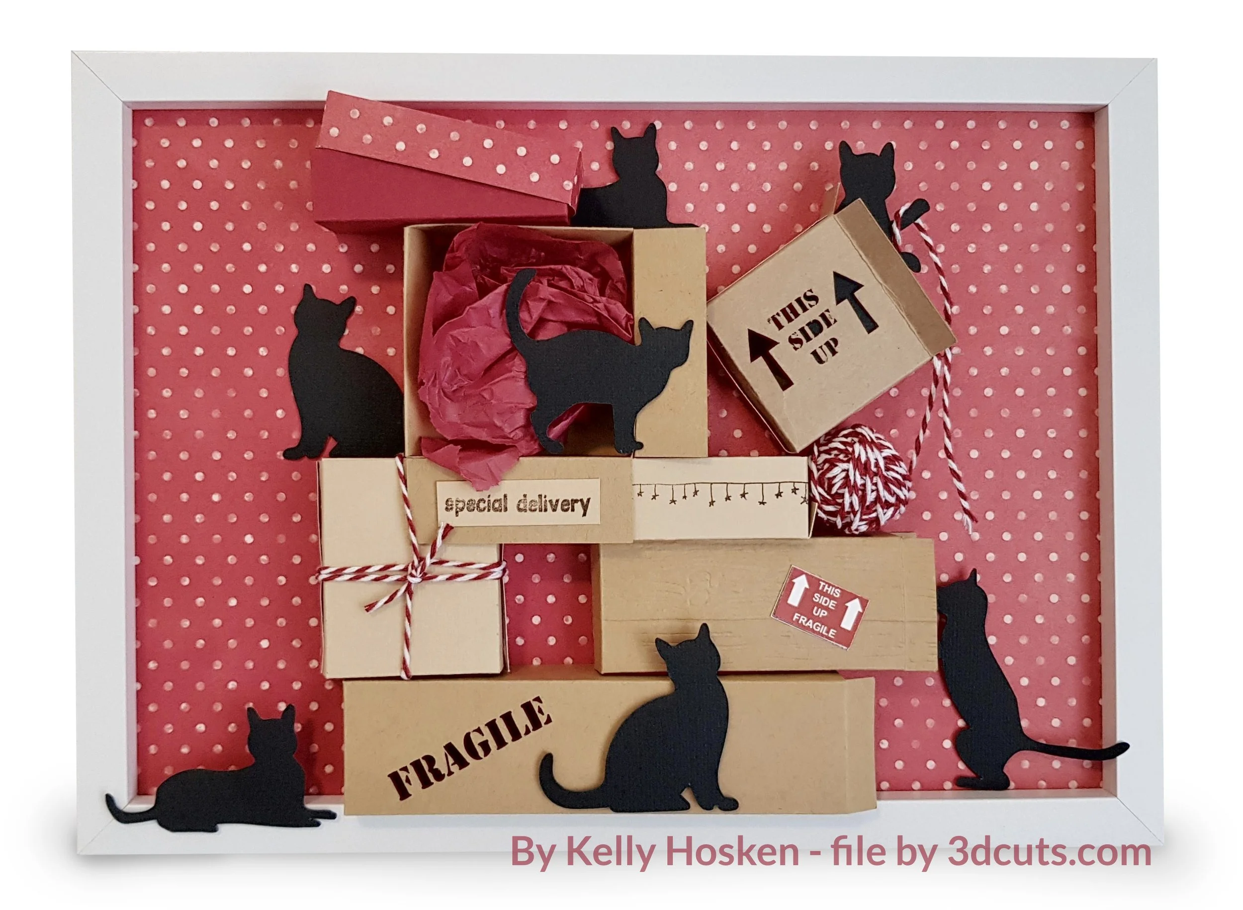 Here is a charming shadow box project combining kitties and boxes. What mischief! It is designed to be cut out of card stock and installed in a purchased 12 x12” shadow box frame.