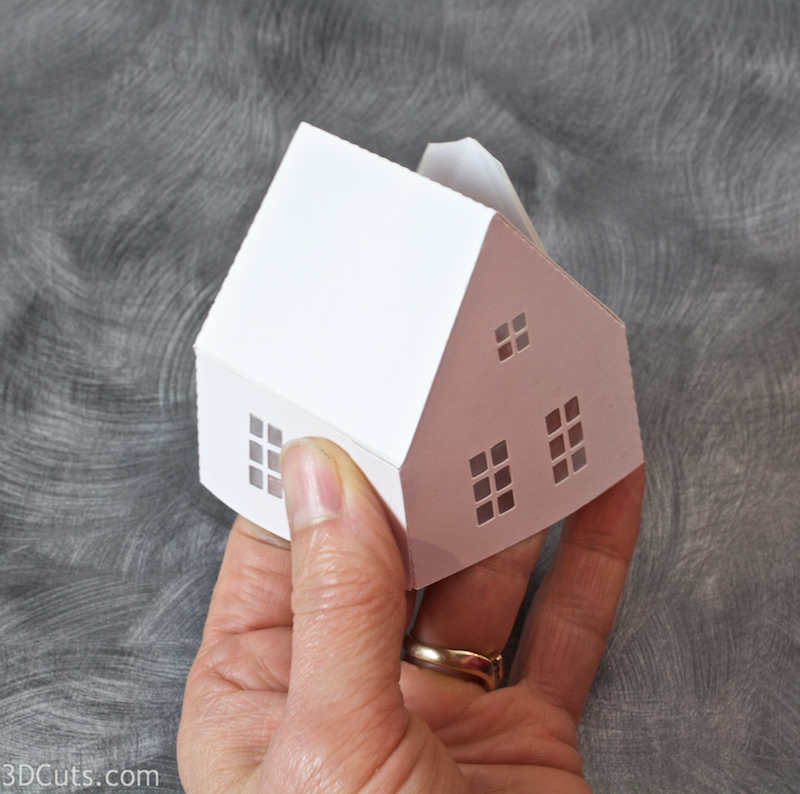 Peel the Scor-Tape off the back roof and press in place. The Tudor style home is ready to be added to all the other houses in Tea Light Village.
