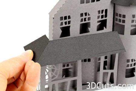 - Use Scor-Tape on the inside of the bottom tabs and attach the porch to the front of the house. It fits right around the porch floor on the main house and reaches from the tower and around the porch floor.